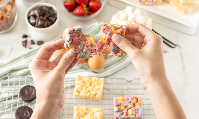 The Mindful version swaps in a more health-conscious cereal, which is grain-free and high-protein, and replaces sugar with a blend of allulose and monk fruit extract. You’ll still get that chewy, crunchy marshmallow experience, just without the carb overload or added sugar.