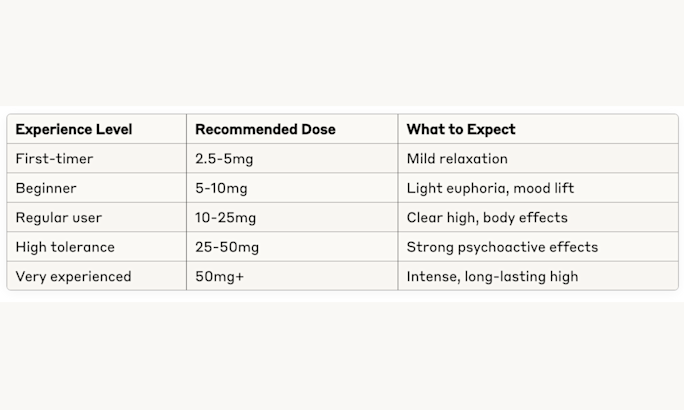 3.5g of 10% THC ÷ 32 pieces = 11mg each (moderate dose)