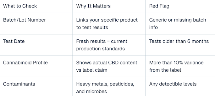Here's what separates reliable brands from the wildcards: they test every batch, not just once in 2019. Look for these specifics on any Certificate of Analysis (COA):