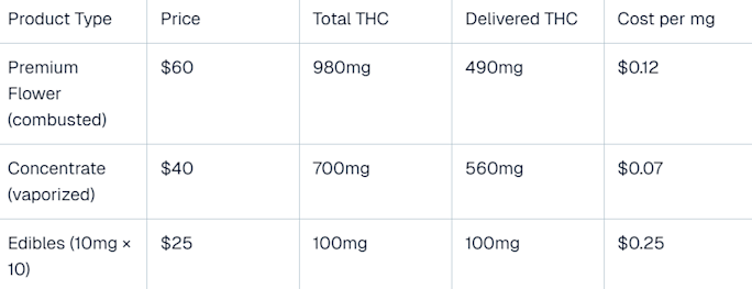 Let's calculate the actual value using the delivered THC per dollar. A $60 eighth (3.5g) of 28% THC flower contains 980mg total THC.