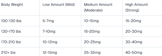Take 5-10mg THC per 100 pounds of body weight for a mild experience, or 10-15mg per 100 pounds for a stronger experience.