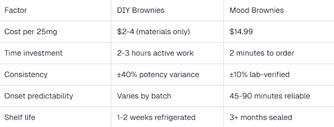 You're buying the confidence that comes from batch-specific lab testing, consistent amounts that let you plan your evening precisely, and the quality standards you didn't spend covered in cannabutter trying to figure out why your kitchen smells like a dispensary.