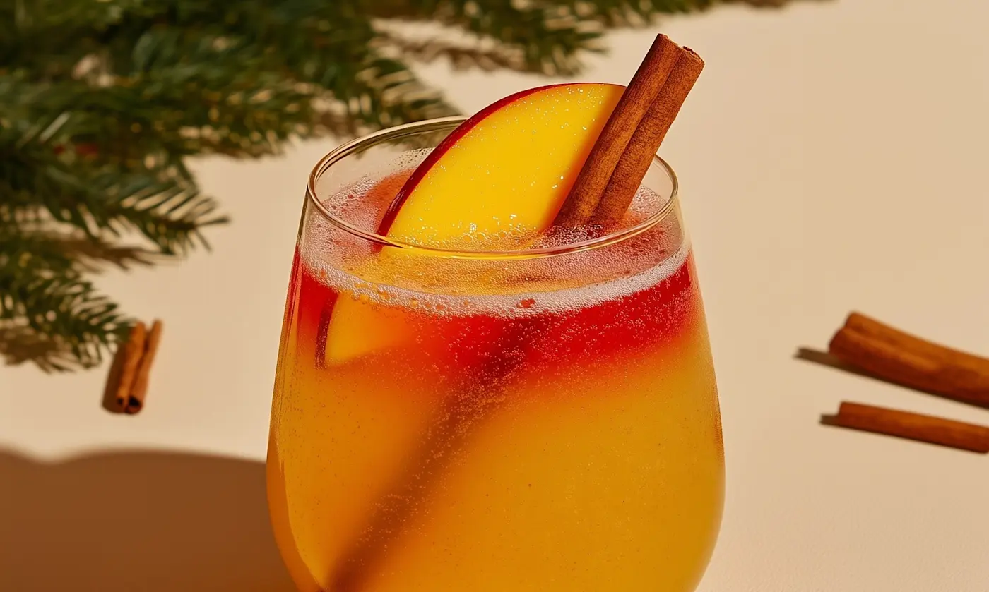 Juicy THC Peach Mango Seltzer and sparkling cider bring a splash of tropical warmth to your holiday cheer, while cinnamon adds just the right touch of festive spice.