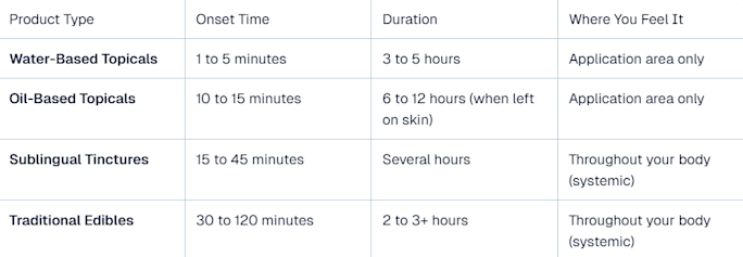 Topical CBD works in 1-15 minutes for localized relief. Oral CBD takes 15-120 minutes but affects your whole body. Get exact timing and duration data.