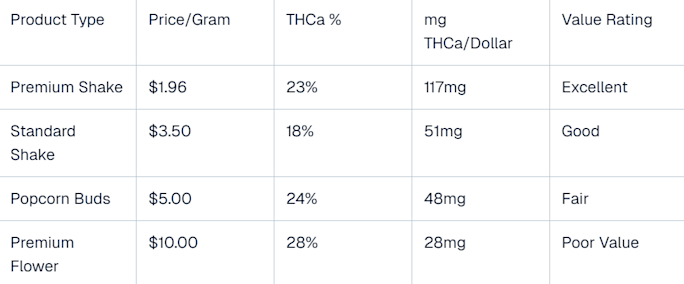Premium flower with 28% THC costs $10/gram, or $0.036 per milligram. The shake delivers nearly identical psychoactive value at one-quarter the price.