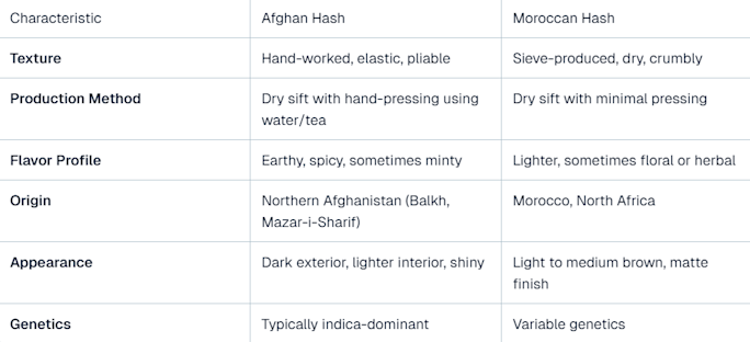The production methods create these distinct characteristics—Afghan's intensive hand-working produces that elastic, oily texture, while Moroccan's gentler sieve method preserves a drier, more powdery consistency.
