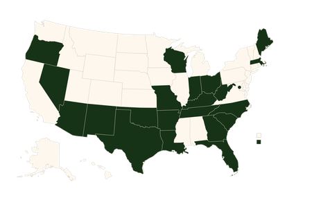 Arizona, Arkansas, District of Columbia, Florida, Georgia, Indiana, Kentucky, Louisiana, Massachusetts, Maine, Missouri, Nevada, North Carolina, Ohio, Oklahoma, Oregon, South Carolina, Tennessee, Texas, West Virginia, Wisconsin, New Mexico