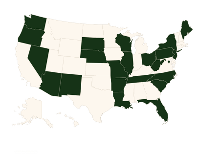 Arizona, Arkansas, District of Columbia, Florida, Illinois, Louisiana, Maine, Missouri, Nebraska, Nevada, New York, New Jersey, North Carolina, Oregon, Ohio, Pennsylvania, South Carolina, Tennessee, Washington, West Virginia, Wisconsin, New Mexico