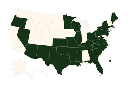 Arizona, Arkansas, District of Columbia, Florida, Georgia, Illinois, Kansas, Kentucky, Louisiana, Maine, Massachusetts, Mississippi, Missouri, Nevada, New Jersey, New Mexico, New York, North Carolina, Ohio, Oklahoma, Oregon, Pennsylvania, South Carolina, Tennessee, Texas, Virginia, West Virginia, Wisconsin