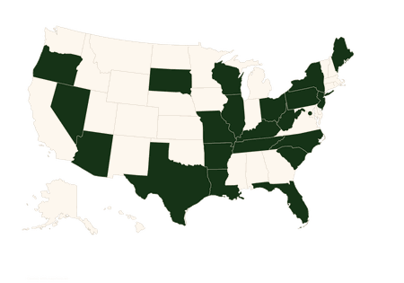 Arkansas, Arizona, District Of Columbia, Florida, Illinois, Kentucky, Louisiana, Maine, Missouri, New Jersey, New York, Nevada, North Carolina, Oregon, Ohio, Pennsylvania, South Carolina, Tennessee, Texas, West Virginia, Wisconsin.