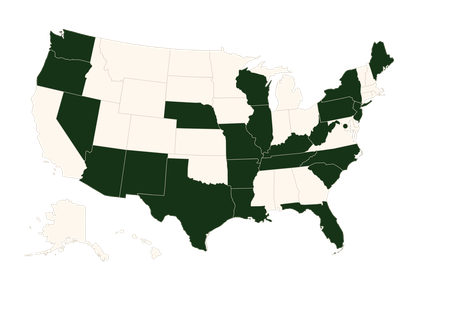 Arizona, Arkansas, District of Columbia, Florida, Illinois, Kentucky, Louisiana, Maine, Missouri, Nebraska, Nevada, New York, New Jersey, North Carolina, Oregon, Pennsylvania, South Carolina, Tennessee, Texas, Washington, West Virginia, Wisconsin, New Mexico