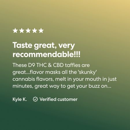 Dessert-flavored taffy for a super sweet high. Each piece of taffy contains 15mg of happy Delta-9 THC and 15mg of calming CBD.