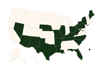 Arizona, Arkansas, District of Columbia, Florida, Illinois, Kentucky, Louisiana, Maine, Missouri, Nebraska, Nevada, New York, North Carolina, Ohio, Pennsylvania, South Carolina, Tennessee, Texas, West Virginia, New Mexico
