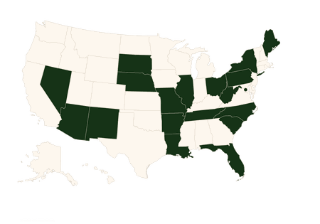 Arizona, Arkansas, District of Columbia, Florida, Illinois, Louisiana, Maine, Missouri, Nebraska, Nevada, New York, North Carolina, Ohio, Pennsylvania, South Carolina, Tennessee, West Virginia, New Mexico