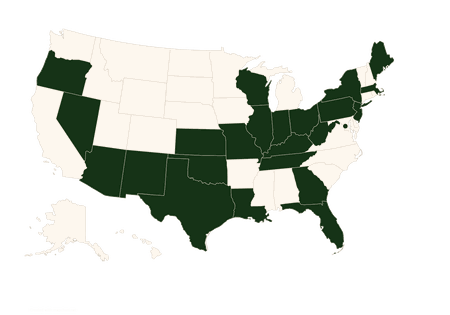 Arizona, District of Columbia, Florida, Georgia, Illinois, Indiana, Kansas, Kentucky, Louisiana, Maine, Massachusetts, Mississippi, Missouri, Nevada, New Jersey, New Mexico, New York, North Carolina, Oklahoma, Oregon, Ohio, Pennsylvania, South Carolina, Tennessee, Texas, Virginia, West Virginia, Wisconsin