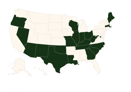 Arizona, District of Columbia, Georgia, Indiana, Illinois, Kentucky, Louisiana, Massachusetts, Maine, Missouri, Nevada, New Mexico, North Carolina, Oklahoma, Oregon, Ohio, South Carolina, Tennessee, Texas, West Virginia, Wisconsin.