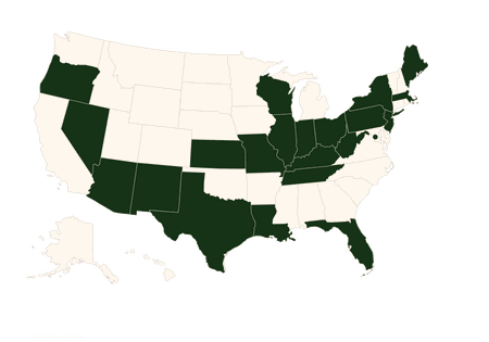 Arizona, District of Columbia, Florida, Illinois, Indiana, Kansas, Kentucky, Louisiana, Maine, Massachusetts, Mississippi, Missouri, Nevada, New Jersey, New Mexico, New York, North Carolina, Oregon, Ohio, Pennsylvania, South Carolina, Tennessee, Texas, Virginia, West Virginia, Wisconsin