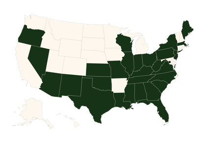 Alabama, Arizona, District of Columbia, Florida, Georgia, Illinois, Indiana, Kansas, Kentucky, Louisiana, Maine, Massachusetts, Mississippi, Missouri, Nevada, New Jersey, New Mexico, New York, North Carolina, Ohio, Oklahoma, Oregon, Pennsylvania, South Carolina, Tennessee, Texas, Virginia, West Virginia, Wisconsin