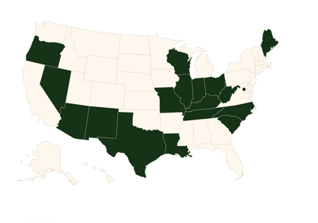 Arizona, District of Columbia, Illinois, Indiana, Kentucky, Louisiana, Maine, Missouri, Nevada, New Mexico, North Carolina, Oregon, Ohio, South Carolina, Tennessee, Texas, West Virginia, Wisconsin