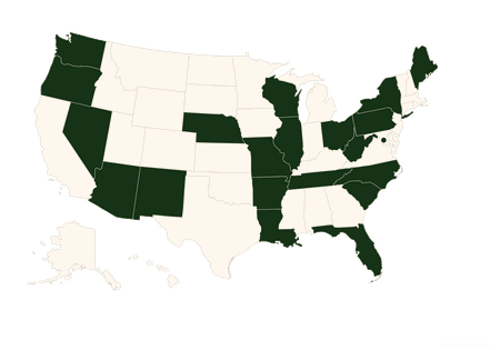 Arizona, Arkansas, District of Columbia, Florida, Illinois, Louisiana, Maine, Missouri, Nebraska, Nevada, New York, North Carolina, Oregon, Ohio, Pennsylvania, South Carolina, Tennessee, Washington, West Virginia, Wisconsin, New Mexico