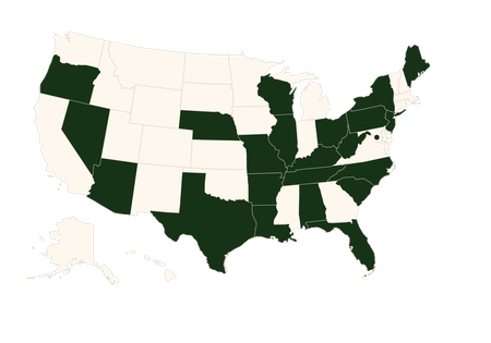 Alabama, Arizona, Arkansas, District of Columbia, Florida, Illinois, Kentucky, Louisiana, Maine, Missouri, Nebraska, Nevada, New Jersey, New York, North Carolina, Ohio, Oregon, Pennsylvania, South Carolina, Tennessee, Texas, West Virginia, Wisconsin