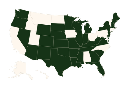 Arizona, Arkansas, District of Columbia, Delaware, Florida, Georgia, Illinois, Indiana, Kansas, Kentucky, Louisiana, Maine, Massachusetts, Michigan, Minnesota, Mississippi, Missouri, Nebraska, Nevada, New Hampshire, New Jersey, New Mexico, New York, North Carolina, Oklahoma, Oregon, Pennsylvania, South Carolina, South Dakota, Tennessee, Texas, Virginia, West Virginia, Washington, Wisconsin, Wyoming