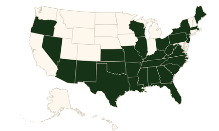 Alabama, Arizona, Arkansas, District of Columbia, Florida, Georgia, Illinois, Kansas, Kentucky, Louisiana, Maine, Massachusetts, Mississippi, Missouri, Nevada, New Jersey, New Mexico, New York, North Carolina, Ohio, Oklahoma, Oregon, Pennsylvania, South Carolina, Tennessee, Texas, Virginia, West Virginia, Wisconsin