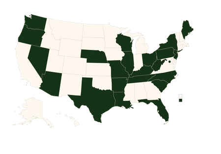 Arizona, Arkansas, District of Columbia, Florida, Illinois, Kentucky, Louisiana, Maine, Missouri, Nebraska, Nevada, New York, New Jersey, North Carolina, Ohio, Oregon, Pennsylvania, South Carolina, Tennessee, Texas, Washington, West Virginia, Wisconsin