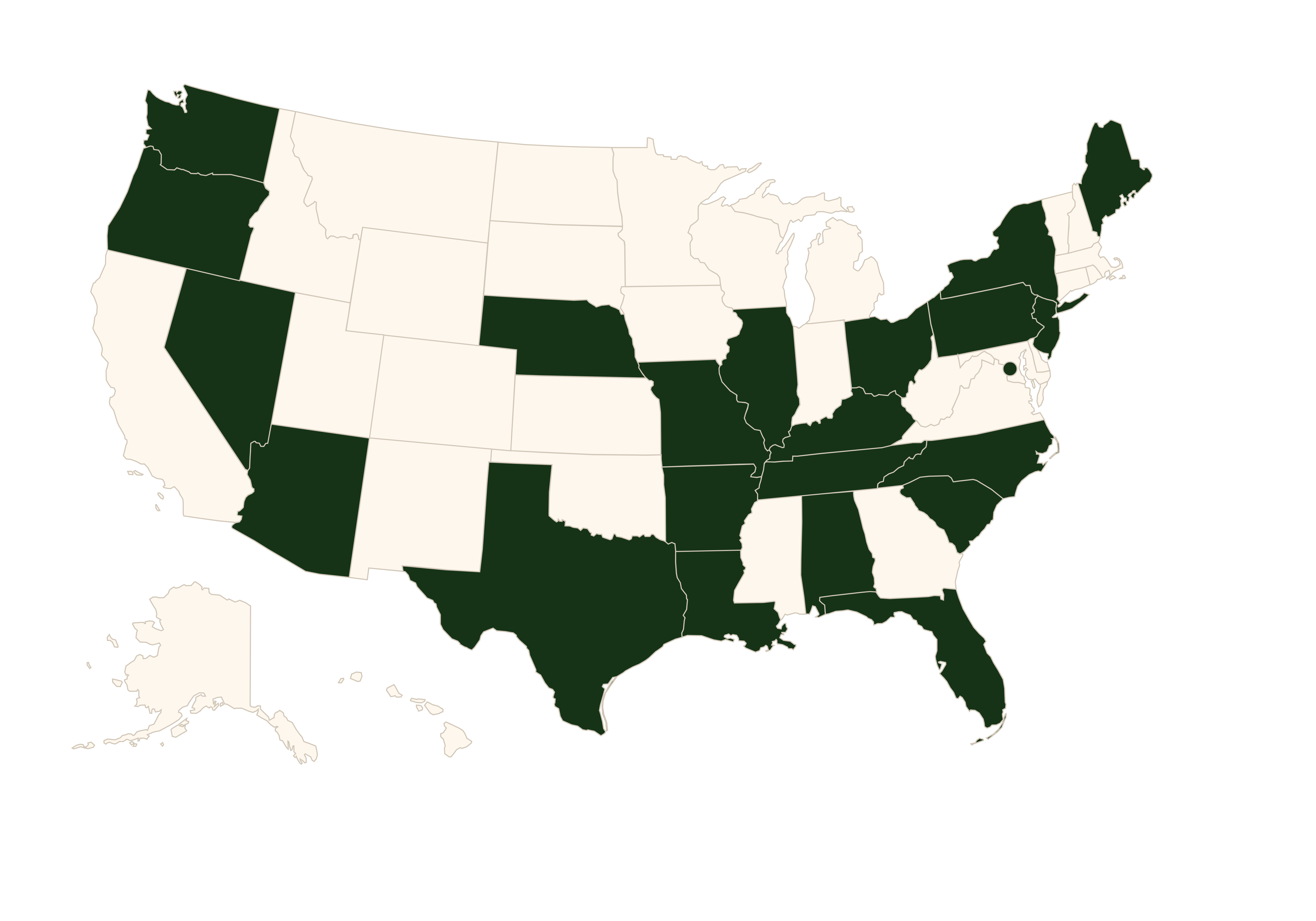 Alabama, Arizona, Arkansas, District of Columbia, Florida, Illinois, Kentucky, Louisiana, Maine, Missouri, Nebraska, Nevada, New York, New Jersey, North Carolina, Ohio, Oregon, Pennsylvania, South Carolina, Tennessee, Texas, Washington, West Virginia, Wisconsin