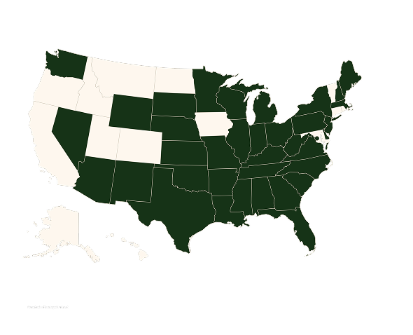 Alabama, Arizona, Arkansas, District of Columbia, Delaware, Florida, Georgia, Illinois, Indiana, Kansas, Kentucky, Louisiana, Maine, Massachusetts, Michigan, Minnesota, Mississippi, Missouri, Nebraska, Nevada, New Hampshire, New Jersey, New Mexico, New York, North Carolina, Ohio, Oklahoma, Oregon, Pennsylvania, South Carolina, South Dakota, Tennessee, Texas, Virginia, Washington, West Virginia, Wisconsin, Wyoming