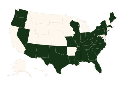 Alabama, Arizona, District of Columbia, Florida, Illinois, Indiana, Kentucky, Louisiana, Maine, Missouri, Nebraska, Nevada, New York, New Jersey, North Carolina, Ohio, Oregon, Pennsylvania, South Carolina, Tennessee, Texas, West Virginia, Wisconsin, Washington