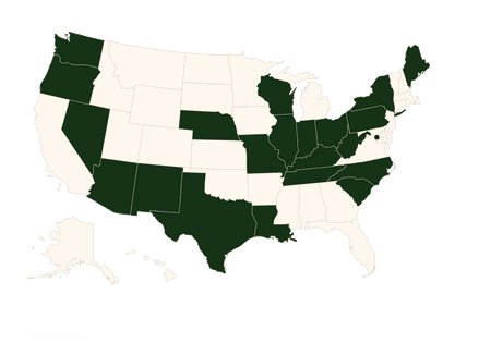 Arizona, District of Columbia, Illinois, Indiana, Kentucky, Louisiana, Maine, Missouri, Nebraska, Nevada, New York, North Carolina, Oregon, Ohio, Pennsylvania, South Carolina, Tennessee, Texas, West Virginia, Wisconsin, Washington, New Mexico
