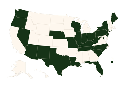 Arizona, District of Columbia, Florida, Illinois, Indiana, Kentucky, Louisiana, Maine, Missouri, Nebraska, Nevada, New York, New Jersey, North Carolina, Ohio, Oregon, Pennsylvania, South Carolina, Tennessee, Texas, West Virginia, Wisconsin, Washington, New Mexico