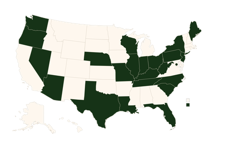 Arizona, District of Columbia, Florida, Illinois, Indiana, Kentucky, Louisiana, Maine, Missouri, Nebraska, Nevada, New York, New Jersey, North Carolina, Ohio, Oregon, Pennsylvania, South Carolina, Tennessee, Texas, West Virginia, Wisconsin, Washington