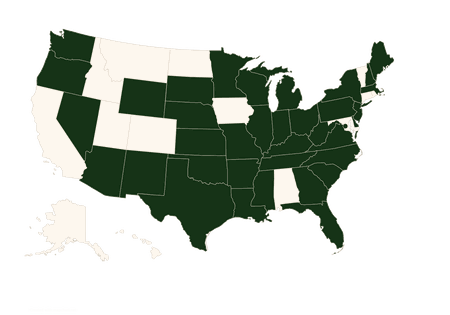 Arizona, Arkansas, District of Columbia, Delaware, Florida, Georgia, Illinois, Indiana, Kansas, Kentucky, Louisiana, Maine, Massachusetts, Michigan, Mississippi, Missouri, Nebraska, Nevada, New Hampshire, New Jersey, New Mexico, New York, North Carolina, Oklahoma, Oregon, Ohio, Pennsylvania, South Carolina, South Dakota, Tennessee, Texas, Virginia, Washington, West Virginia, Wisconsin, Wyoming, Minnesota