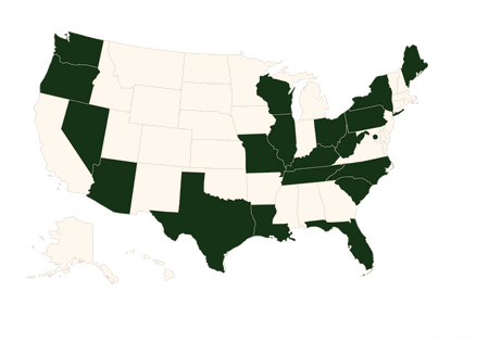 Arizona, District of Columbia, Florida, Illinois, Kentucky, Louisiana, Maine, Missouri, Nevada, New York, North Carolina, Oregon, Ohio, Pennsylvania, South Carolina, Tennessee, Texas, West Virginia, Wisconsin, Washington.