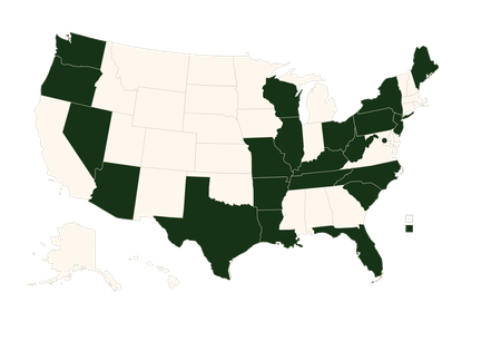 Arizona, Arkansas, District of Columbia, Florida, Illinois, Kentucky, Louisiana, Maine, Missouri, Nevada, New Jersey, New York, North Carolina, Ohio, Oregon, Pennsylvania, South Carolina, Tennessee, Texas, West Virginia, Wisconsin, Washington.