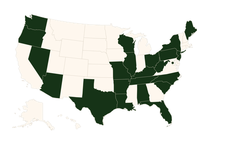 Alabama, Arizona, Arkansas, District of Columbia, Florida, Illinois, Kentucky, Louisiana, Maine, Missouri, Nevada, New Jersey, New York, North Carolina, Ohio, Oregon, Pennsylvania, South Carolina, Tennessee, Texas, West Virginia, Wisconsin, Washington.